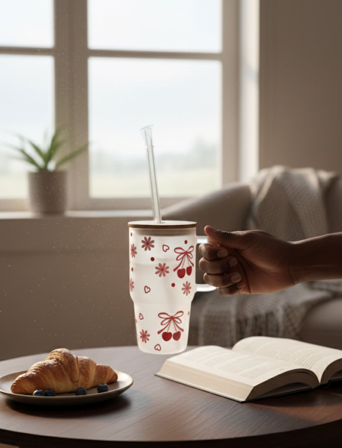 Frosted Cherry Glass Tumbler - 20oz Iced Coffee Cup with Bamboo Lid
