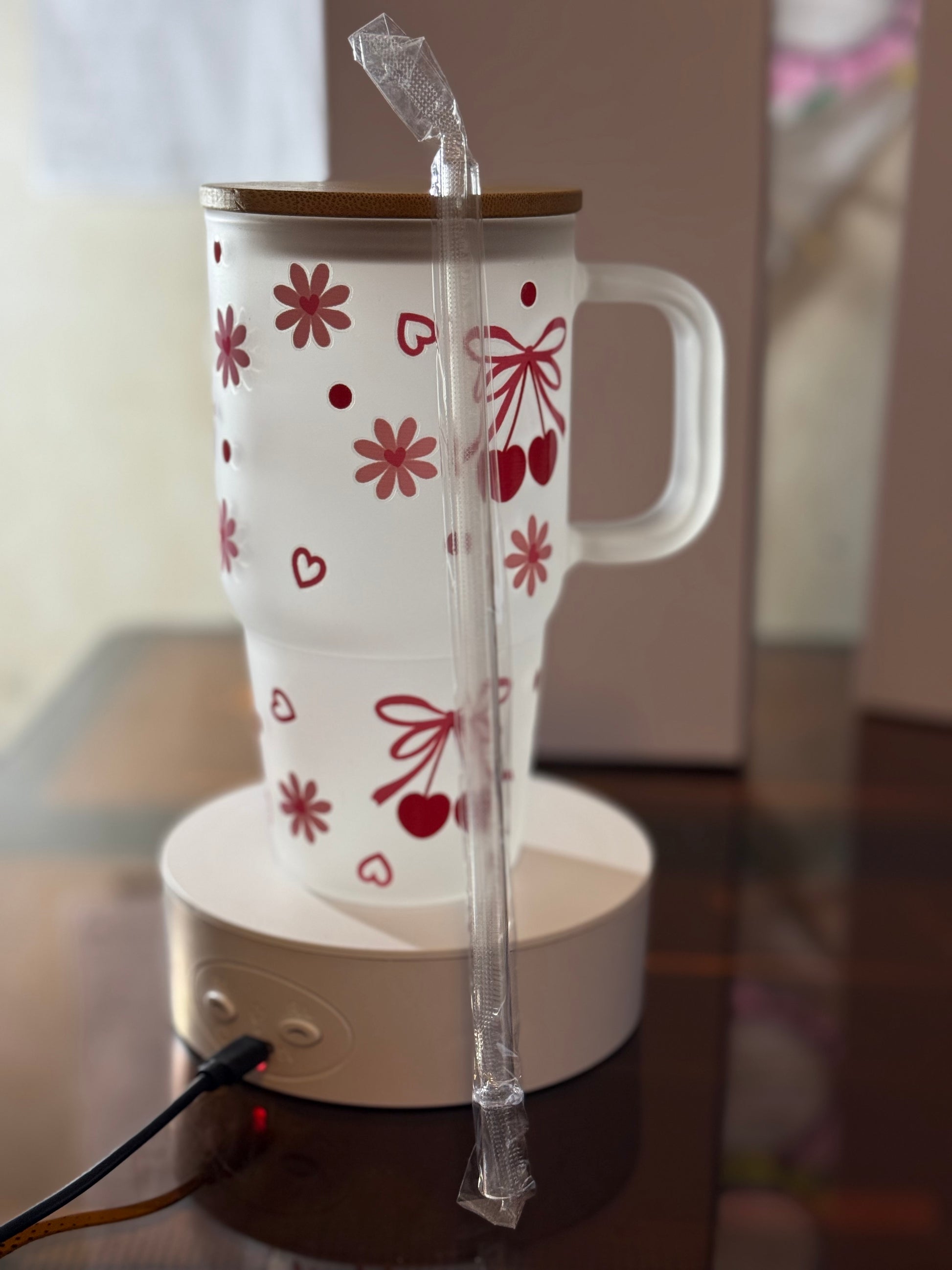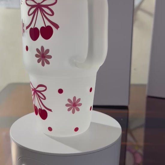 Upgrade your hydration game with this oversized, coquette-style frosted glass tumbler. At 20 ounces, itās the perfect size for those who need a little extra caffeine or water to get through the day. Featuring a charming red cherry and bow design, this tumbler brings a touch of "soft girl" aesthetic to any desk or kitchen.